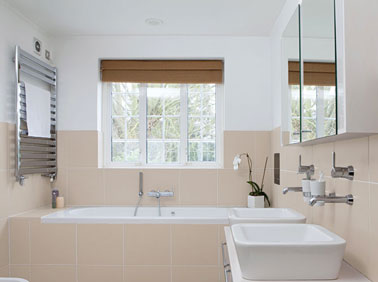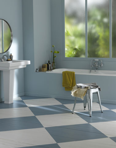 Repeindre le vieux carrelage sol dans la salle de bain est l’occasion de laisser aller sa créativité ! Par exemple, en utilisant plusieurs couleurs de peinture on peut s’amuser à reproduire l’effet d’un tapis de bain, une idée sympa pour personnaliser le sol de sa salle de bain qui demeure très facile à entretenir. Photo : Little Greene