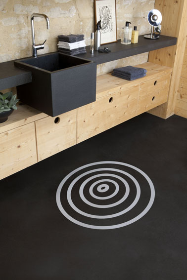 Peindre du carrelage salle de bain en noir pour un rendu design. Ici un jeu de couleurs original apporté avec une spirale peinte en gris, sur une peinture noire forme un tapis de sol devant le lavabo. Photo : V33