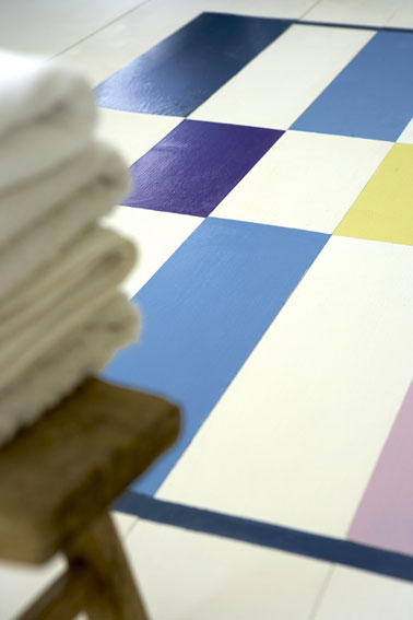 Assortie à la peinture des murs de la salle de bain, couleur Hicks’Bleu, la peinture sol couleur violet « Purpleheart188 » , jaune « Narcissus 194 » bleu » Tivoli 206 « , parme « Milk Thistle 187 » appliquée en 2 couches. Utilisée pour peindre du carrelage sol, il est nécessaire d’appliquer au préalable un primaire d’accrochage spéciale sol carrelé. Acrylique mat émulsion 33 euros le litre (existe dans différentes finitions et en pot de 1 /2,5 et 5 litres), Peinture Retrospectives, Little Greene tiré du Nouveau nuancier peinture sol de 160 couleurs. Prix : 105 € le pot de 2,5L.