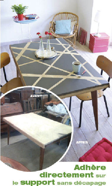 Peindre une table en bois avec la peinture sans décapage V33  avec deux couleurs en contraste dans le nuancier : Sur le plateau Taupe léger et noir Jaie pour former des rayures en diagonales. Photo avant/après application Vernis teinté Ultra Adhérent pour meubles et boiseries V33