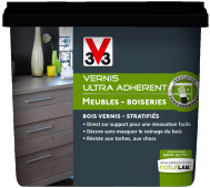 Le vernis ultra adhérent V33 quant à lui recouvre le meuble d’un film teinté de sorte que  le veinage du bois reste visible sous une couleur qui peut être intense, noir ou gris béton par exemple, de manière à le restaurer d’une couche semi-opacifiante et le décorer pour une rénovation totale.