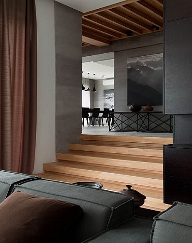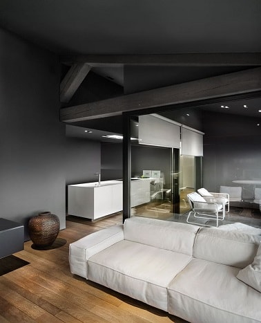 La décoration de cet appartement mise sur du gris à tous les étages. La nuance anthracite habille le canapé, les murs du salon et est repris pour la peinture du couloir et la salle à manger. L’escalier en bois et les poutres apparentes laissées naturelles contrastent avec cette teinte profonde tandis que la console du couloir et le mobilier noir de la salle à manger valorisent la dominante de gris anthracite .