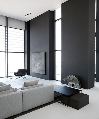 Des murs peint gris profond anthracite se marient à merveille avec un blanc immaculé au sol et sur le canapé du salon.