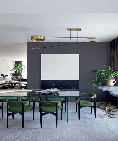 Peindre un mur en gris dans une salle à manger ouverte sur le salon, ça donne tout de suite un coup de fouet à la déco. Moderne, la nuance anthracite est égayée par les chaises vertes, la moquette blanche et le grand tableau d’art contemporain blanc et noir. Une suspension design termine la déco de cette pièce à vivre moderne comme jamais.