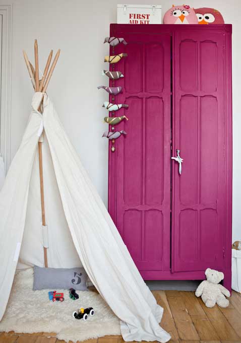 Dans la chambre d'enfant on a repeint l'armoire récup en peinture mat aubergine pour refaire la déco. Une couleur pensée par la Fiancée du Mékong. Réf Rosea
