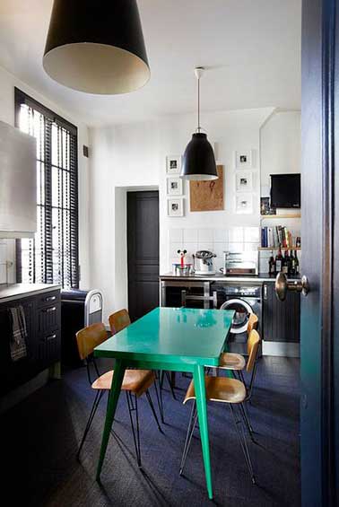 Avec une peinture pour bois, la vieille table de cuisine devient contemporaine dans cette cuisine à la déco actuelle. Une couche de peinture vert funky sur le bois poncé et c’est parti ! Sur la photo, l’envie de repeindre est venue partout dans la cuisine : de la peinture acrylique mat noir sur les meubles de cuisine, les portes et le parquet en bois noir. Au final une cuisine ultra chic pour une déco ultra tendance.