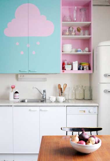Une petite cuisine mignonne à croquer avec les meubles hauts repeints dans une jolie tonalité de couleur pastel. Un rose rose tendre et un bleu turquoise, deux teintes gourmandes et douces pour habiller joliment cette cuisine blanche. Bon plan déco : le motif nuage dessiné sur les portes apporte toute sa poésie à la déco de cuisine