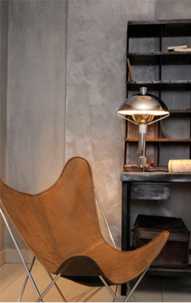 Ici un enduit décoratif à base de ciment teinté dans la masse permettant de recréer l’apparence du béton pour toutes les pièces de la maison. Riche d’un nuancier de vingt couleurs et 6 gris, Aspect brut d’inspiration industrielle qui offre une grande liberté de création pour obtenir des effets différents selon les outils utilisés : strié, lissé ou griffé. On peut l’associer à une finition céruse ou à une cire selon l’effet recherché. Prix pour 10 m2 sous-couche et finition comprise : 230 € collection béton ciré peinture Tollens .