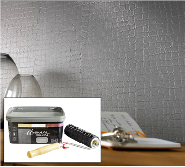 Une peinture effet cuir pour une décoration ethnique à l’aspect « peau d’animal ». Existe en 6 coloris. Les aspects possibles : empreintes de croco, peau d’autruche, serpent (dans 2 dimensions d’écailles) sont obtenus avec des rouleaux d’empreintes. . Conditionnement : 3 kg. Rendement environ 5 m². Lavable et résistant après l’application d’une cire de finition. prix : 13 € le kg chez Castorama.
