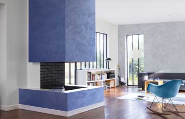 La peinture salon s’anime avec deux couleurs nacrées travaillées en harmonies contrastées. Une nuance gris perle sur un mur du salon structure l’espace et une nuance bleu roi valorise la cheminée.