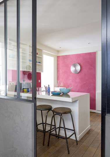 Avec une belle couleur de peinture nacrée rouge, la cuisine blanche gagne en tonus. Appliquée sur le mur face au salon et la crédence ce ton éclatant égaye l’ensemble de la pièce tout en restant dans l’ambiance industrielle de cette cuisine verrière.