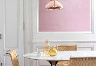 Dans le salon, une peinture rose pailletée joue les troubles fêtes. Appliquée au coeur d’un panneau mouluré elle donne des couleurs aux murs blancs en créant une atmosphère plus conviviale. En total accord avec la table de salle à manger en marbre et les chaises design en bois tressés, elle ramène sa couleur dans un luminaire rose cuivré.