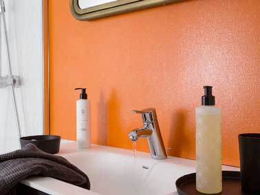 Le mur de la salle de bain s’éclaire avec une belle couleur de peinture orange à paillettes. Une bonne idée déco pour amener de la lumière dans une pièce étroite. Associé en contraste avec le lavabo en faïence blanche et les accessoires de salle de bain en plastique noir, ce mur orange vif donne du tonus à la déco de salle de bain et réveillera tous les matins chagrins.