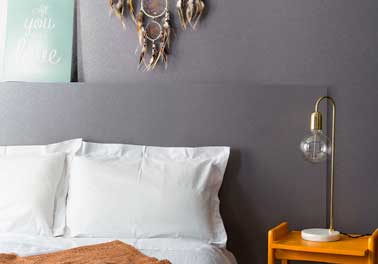 Une tête de lit peinte de la même couleur que les murs gris pailletés se fait discrète pour révéler la déco qui lui est associée. Ici une table de nuit orange pop, une lampe de chevet style loft et un attrape rêves. Draps et oreillers blancs jouent les contrastes et valorisent l’aspect brillant de la peinture.