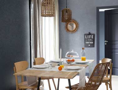 Style scandinave revisité pour la déco de salle à manger avec sa peinture grise. Scintillante et profonde à la fois avec ses reflets brillants, la couleur grise s’équilibre ainsi avec la table et les chaises en bois blond et met en valeur les suspensions et le miroir en osier. Un duo de couleurs et de nuances chaudes totalement réussi grâce à l’effet déco de la peinture.