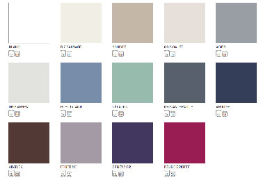 Nuancier peinture carrelage sol et sol type ciment, béton, etc…Tollens pour toutes les pièces intérieures. Résistance extrême aux taches,(cuisine) frottements et rayures (escaliers, entrée, chambre enfant) et lessivable. 13 couleurs pré-conditionnées plus un blanc : 5 nuances de gris : Galet, acier, argent, et gris anthracite. Ardoise, Arabica (chocolat), Feutrine (Parme) Genevrier (violet), Rouge Griotte, Schiste (beige), Riz Sauvage (blanc cassé), Bleu Islande et Céladon (vert).