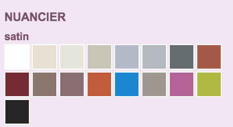 Nuancier peinture 17 teintes : Blanc, corde, blanc patine, bois flotté, gris écume, gris loft, pierre de lave, terre cuite, terre rouge, écorce, basalte, capucine, bleu mistral, gris métallisé, rose lola, vert grenouille, réglisse