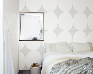 Réalisés au pochoir sur le mur de la tête de lit, des cercles de gris pâle sur une peinture gris moyen créent un discret effet texture et apportent  à la déco de cette chambre blanche une note design  tout en subtilité. Pour reproduire le pochoir, découpez 4 cercles sur un carton rigide et appliquez la deuxième couche de peinture en commençant par le haut du mur. Pour un meilleur effet et pour ne pas surcharger la chambre, il vaut mieux réserver ce pochoir au mur de la tête de lit. Peinture couleur Laponie gris claire, Laponie gris moyen, Laponie blanc, collection Couleurs du Monde Dulux Valentine