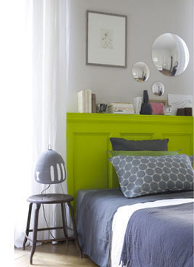 Tête de lit chambre ado peinte en vert anis pour booster le gris perle de la peinture murale et le gris bleuté du linge de lit
