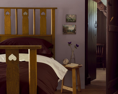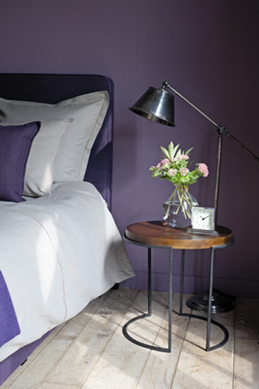 Chambre couleur peinture violet mat idéal pour mettre en valeur le lit en bois style campagnard et pour sublimer le parquet chêne foncé