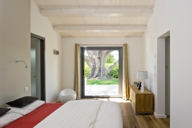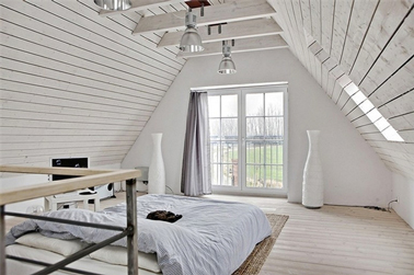 La luminosité d'une peinture blanche dans une chambre qui ne manque pas de douceur. Le lambris du plafond, les murs couvert d'une peinture blanc mat adoucie par la couleur du parquet de chêne blanchi
