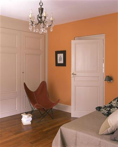 Dans cette chambre d’adulte une association peinture de teintes chaudes jouent de concert  pour créer  une ambiance cosy et non sophistiquée. Aux murs, une peinture  saumon annonce la couleur dès l’entrée, et sur les boiseries, plus subtil qu’une peinture blanche, une teinte de beige rosé amène le contraste, soit, mais tout en douceur. Complétant à merveille la palette couleur, le linge de lit beige rosé et les touches de marron/chocolat. Peinture couleur mur : réf 2069-2, peinture boiserie : 2190-6 nuancier Totem de Tollens.