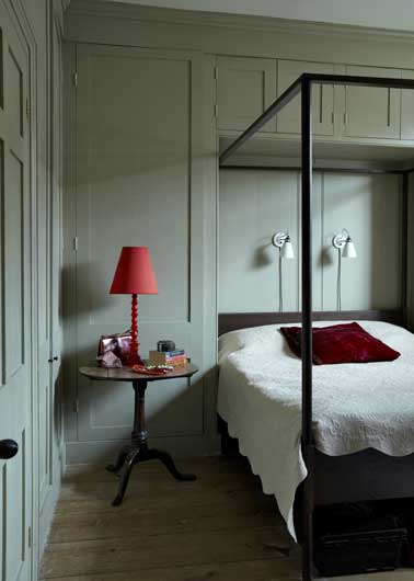 Chambre lumineuse avec couleur de peinture vert pastel sur murs et boiseries. Associée à un lit baldaquin noir et une lampe de chevet rouge. Peinture Farrow&Ball