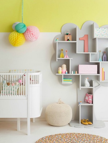 L’univers de la chambre de bébé doit être doux et lumineux mais on peut apporter une couleur vive avec parcimonie.