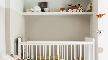 Sans solvant, cette peinture lessivable couleur écrue est idéale pour une chambre de bébé cocon.