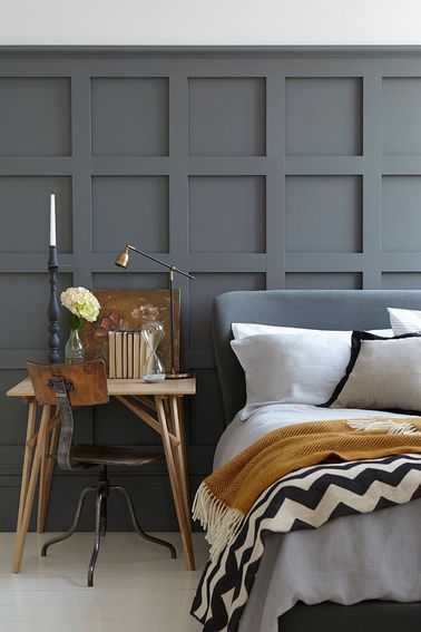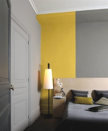 Plutôt que de peindre tout un mur de chambre d’une seule couleur, pourquoi pas associer le gris à une large bande de couleur chaude ? L’avantage du gris est qu’il cohabite bien avec la plupart des couleurs, mais on aime particulièrement l’alliance du gris souris, du gris ardoise avec le jaune moutarde qui fait son retour en force dans les nuanciers peinture ! Couleur Avoine, Granit et Ardoise, Peinture Zolpan.