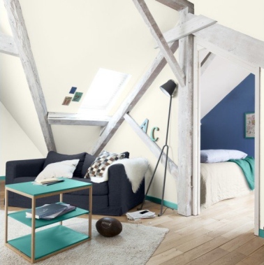 Avec cette ambiance couleur chambre, vous avez l’impression que c’est une bête peinture blanche ? Pas du tout. Saviez-vous qu’il existe une infinité de nuances de blanc ? Cassé avec la couleur de votre choix, il prend du caractère et s’adapte à votre déco. Une chambre blanche, c’est super tendance ! Peinture couleur Blanc Cassé, Blanc Coton et Blanc Intense, Dulux Valentine.