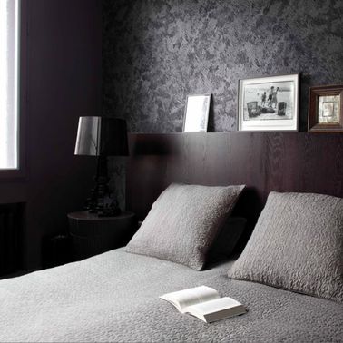 Pour changer d’une peinture lisse et unie dans votre chambre, n’hésitez pas à jouer sur les effets de matière comme avec cette chambre gris anthracite. Ce type de peinture à effet existe dans une variété d’effets qui vous séduiront. Elles sont abordables pour les débutants et certaines peuvent être appliquées en un seul passage pour repeindre la chambre rapido. Peinture collection les Intemporels, Tollens.