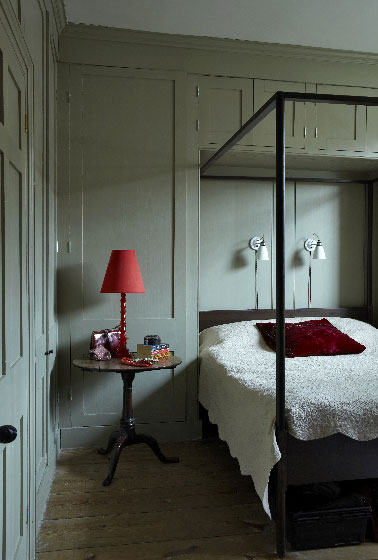 La peinture grise n’a pas de limite pour varier ses nuances, et c’est tant mieux pour la chambre ! Entre gris et vert cette couleur proposée par Farrow & ball semble envelopper la chambre cocooning d’une atmosphère où calme et intimité se mêlent pour créer une ambiance hyper relaxante. Ce gris exprime toute sa force tranquille avec des meubles foncés et de logiques touches de rouge, sa couleur complémentaire. Peinture French Gray par Farrow & Ball.