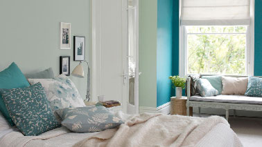 Les bleus clairs agrandissent une petite chambre et la font lumineuse si elle est sombre. Les teintes foncés augmentent l’aspect intime. Couleur Mur : bleu Marmara, Plinthes : blanc, Tête de lit : lin naturel Peinture Dulux Valentine