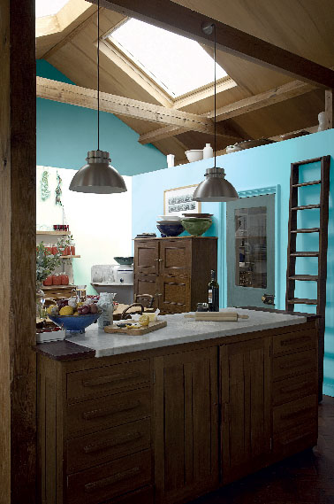 Lorsque les meubles de la cuisine sont en bois foncé, inviter une teinte flashy sur les murs c’est profiter de son effet lumineux pour égayer et moderniser toute la pièce. Un bon exemple avec cette cuisine ou une peinture d’un bleu franc réveille et même les met en valeur. Autre touche de modernité, la porte peinte dans un ton de vert/bleu très tendance. Pour compenser l’absence de fenêtre dans cette cuisine à l’ossature bois éclairée par un Vélux, une bonne idée à retenir, le mur du fond est peint dans un blanc pur satiné qui au passage sublime le bleu. Peinture couleur bleu R1.23.72, Vert/bleu Q0.20.60 à faire en machine à teinter dans la gamme Ligne Pro Astral. Disponible en aspect satin et mat. Pot de 5L prix : 29.90 €, Pot de 10L : 49.90 €