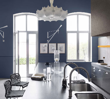 Un bleu moderne pour repeindre une cuisine avec des meubles et table en inox c’est classe ! Peinture Gamme Couture Dulux Valentine chez Castorama
