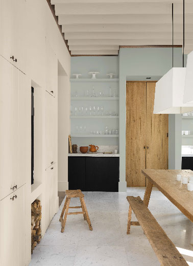 L’ambiance de la cuisine d’antan revisitée avec cette peinture couleur lin assortie à un bleu clair sur un pan de mur dont l’effet lumière est amplifié par le contraste avec les placards noir mat. Une palette de teintes douces sur les murs renforcée par le bois clair de la table de ferme et de la porte du cellier laissée à l’état brut. Pour ne pas rompre l’harmonie, le plafond est peint dans une nuances de lin légèrement teintée de orange laissant ainsi le blanc des abats-jours et de la vaisselle apporter des touches de lumière. Couleur Lin Ecru, Nude Pêche et Ruban Bleu peinture gamme Couture collection Romantique.