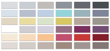 Nuancier 36 teintes de la gamme Cuisine & Bains Dulux Valentine. Quelques exemples : figue, bleu indien, gris tendance, hammam, sorbet citron, lin brut, taupe, crème de cassis, rouge andalou.