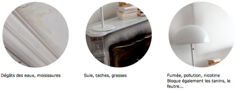 Cette nouvelle peinture, qui s’applique direct sur murs, plafond et boiserie, masque parfaitement et durablement toutes les taches, même les plus difficiles comme les taches d’humidité, de moisissures après une fuite d’eau, les méfaits d’une trop grande condensation dans la salle de bain ou la cuisine, les taches de suie et grasse autour de la cheminée, les traces déposées par les fumées de tabac, la pollution, les taches de feutres de vos bambins créatifs. Elle ne nécessite aucun travaux préparatoires, vous pouvez donc entamer la rénovation de votre pièce sans avoir à passer par le lessivage et la sous-couche comme l’exige toutes autres peintures.