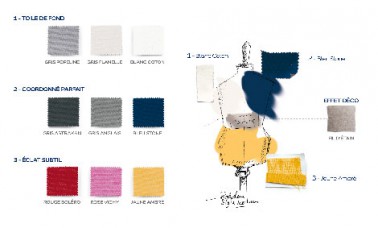 Suggestion d’harmonie avec la collection Modern : Bleu Stone, Jaune Ambré et Blanc Coton pour le contraste, et Fil d’Etain pour son effet précieux. Palette : Dulux Valentine