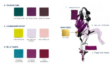 Exemple de combinaison couleurs possible avec la collection Glamour : Feutrine Prune, Pourpre de Venise, Mousseline Parme et Fil d’Or pour un effet métal. Photo : Dulux Valentine