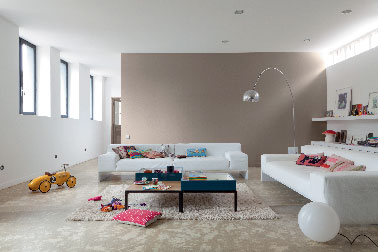 Une peinture salon couleur terre et blanc finition mat et lessivable pour profiter de l'effet chic de la peinture mat sans se soucier de l'apparition de tache de graisse ou de doiget sur les murs !  Peinture DécoLab Mat 100% résistant V33