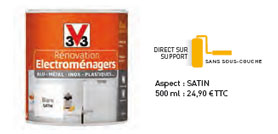 Avec Rénovation Electroménagers V33 vous allez pouvoir repeindre tous les éléments électroménagers de votre cuisine : c’est une peinture pour frigo, celui que l’on aime le plus relooker, mais aussi tous les autres éléments dans la cuisine : lave-vaisselle, micro-onde, congélateur… Vous pouvez même jouer sur les couleurs puisque la peinture est disponible en 6 couleurs différentes : Blanc, fleur de sel, carbonate, piment, cassis et noir réglisse.