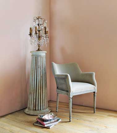 En couleur salon des tons doux de rose sur les murs et de vert de gris pour le petit fauteuil et la colonne en bois amènent un esprit boudoir dans ce petit salon. Deux nuances à assortir sans fausse note dans toutes les pièces. Cette peinture rose s’intégre aussi dans une déco plus contemporaine pour adoucir la ligne des meubles design.