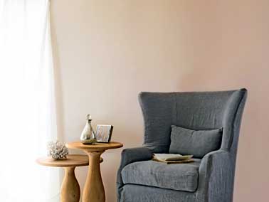 Harmonie douce et apaisante pour une déco salon cosy grâce à une peinture rose poudré. Un ton lumineux idéal pour valoriser une déco chic. Ici, la couleur rose souligne les lignes des deux tables basses en bois et valorise le petit fauteuil en velours gris. Une teinte claire à travailler aussi avec une couleur pastel ou du bleu marine pour une créer une ambiance raffinée dans une chambre ou une autre pièce.