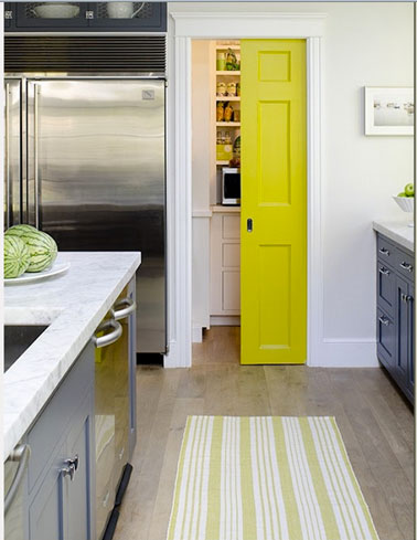 Dans cette cuisine, la couleur jaune sur la porte de l’arrière cuisine crée une dynamique et met en valeur le gris des meubles et le blanc des deux plans de travail.
