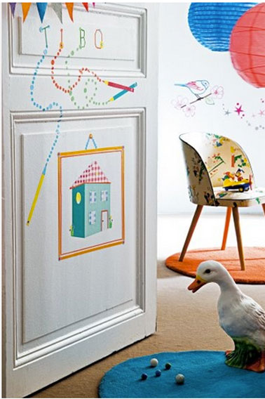 Pour rentrer en douceur dans l’univers de cette chambre d’enfant, la porte affiche la couleur en reprenant le thème et l’harmonie de couleurs des décorations murales qui ornent la chambre.