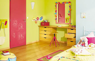 Dans cette chambre de petite fille, la porte est repeinte avec une peinture à tableau dans la même couleur rose bonbon des quelques accessoires et jouets. Une idées de peinture sympa et ludique pour les enfants qui peuvent dessiner sur la porte de leur chambre sans se faire gronder !