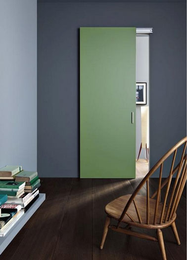 Subtile harmonie de gris et vert dans cet espace. La porte coulissante peinte en vert jade rehausse le gris des murs, crée un lien couleur tout en douceur entre les deux tons des parquets. Un discret rappel de vert est fait avec les couvertures de livres visibles.