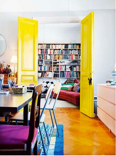 Dans cet espace jour, les couleurs primaires sont à l’honneur ! Le jaune vif utilisé pour peindre la double porte est le lien logique entre le rouge du canapé et le bleu du tapis et des quelques accessoires de la salle à manger.